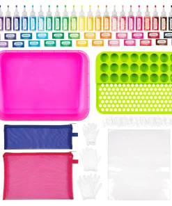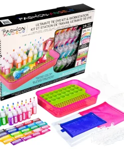 Teignez vos articles préférés en vingt-quatre couleurs de l’arc-en-ciel avec le kit de teinture ultime et le poste de travail. Amusez-vous à créer des modes tie dye avec votre famille et vos amis. Tout est prévu dans ce kit de valeur contenant vingt-quatre couleurs vibrantes, vingt-quatre recharges de poudre colorante, deux cents bandes élastiques, un plateau moulé avec vingt-quatre porte-bouteilles et un égouttoir fonctionnel dans une grande baignoire et trente paires de gants sans latex de tailles assorties petite, moyenne et grande. Deux sacs de rangement en filet et un grand sac à fermeture à glissière sont inclus pour organiser toutes vos fournitures de teinture.
